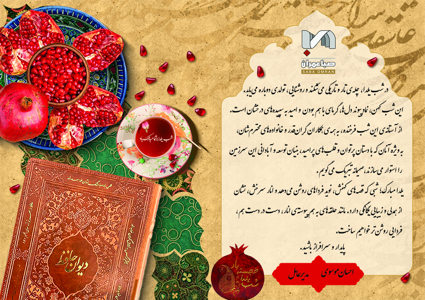 مهندس احسان موسوی، مدیرعامل هلدینگ صبا عمران طی پیامی فرارسیدن شب یلدا را تبریک گفت.
